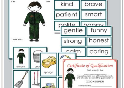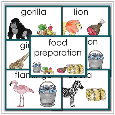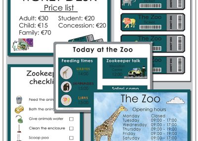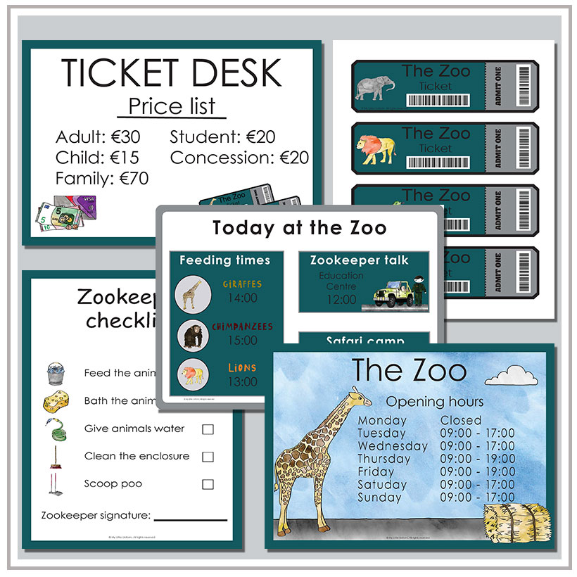 Perfect for setting up a Zoo dramatic play area at home or in your early years classroom. This printable pdf includes lots of display posters, vocabulary cards, forms, charts, and writing prompts to help children learn through play, and learn all about the important work that Zookeepers do.